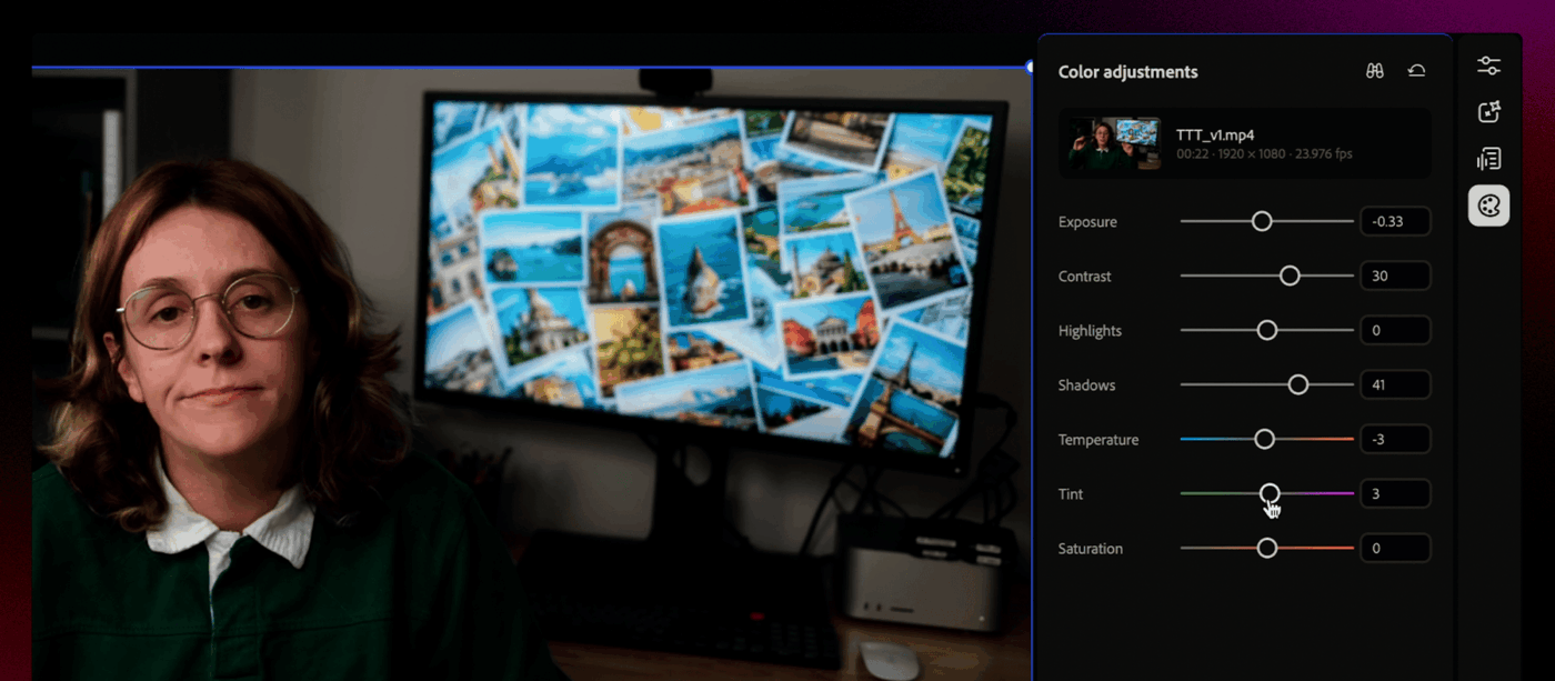 Ajustes de color: los creadores pueden ajustar con precisión la exposición, el contraste, la saturación, la temperatura y otros elementos visuales clave dentro del editor de vídeo de Firefly. Los deslizadores intuitivos ponen a los creadores en control de la intensidad de cada ajuste, mientras que los looks de un clic facilitan empezar.