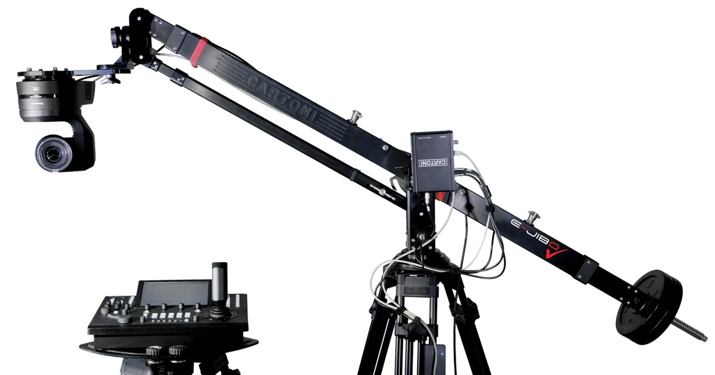 Cartoni ha colaborado con SMPTE RiS y con las principales empresas que trabajan en la unificación de tecnologías para ICVFX, con el objetivo de crear un entorno más abierto para producciones de Realidad Virtual, Mixta y Extendida en el futuro. Para flujos de trabajo de producción virtual, el E-Jibo codificado integra encoders de alta precisión capaces de 4,1 millones de cuentas por vuelta (resolución de 22 bits), lo que permite un seguimiento preciso de los movimientos de brazo y panorámica. El sistema soporta cargas de hasta 20 kg (44,1 lb) y se integra con cámaras PTZ de tracking y cabezales E de Cartoni para aplicaciones AR y VR. Los datos se recopilan y transmiten a través del Cartoni VR Box 2.0 o el sistema Miraxyz RigFX.