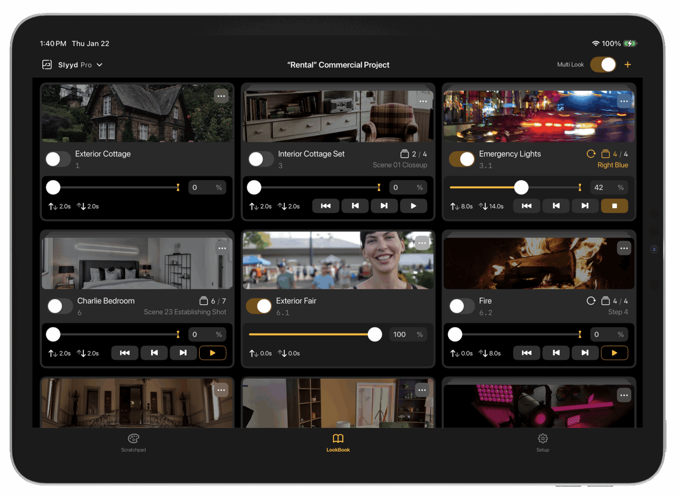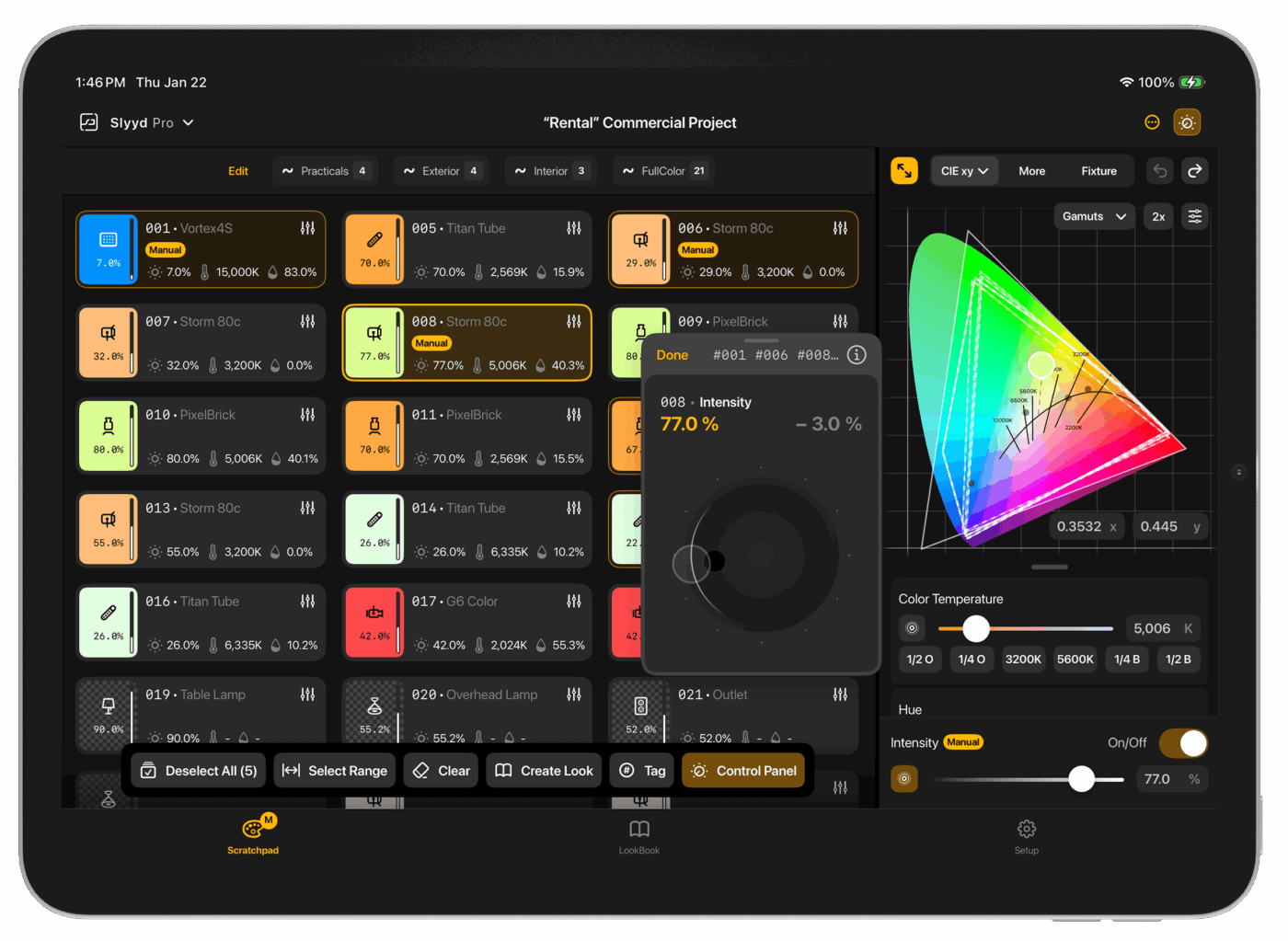 El algoritmo de color propietario de Slyyd mantiene un color consistente y predecible entre múltiples marcas y tipos de luminarias, compatible con los entornos mixtos habituales en producciones de cine, televisión y estudio. Funcionando en iPadOS e iOS, Slyyd permite que el control de iluminación se desplace libremente por los sets y en exteriores sin compromisos.