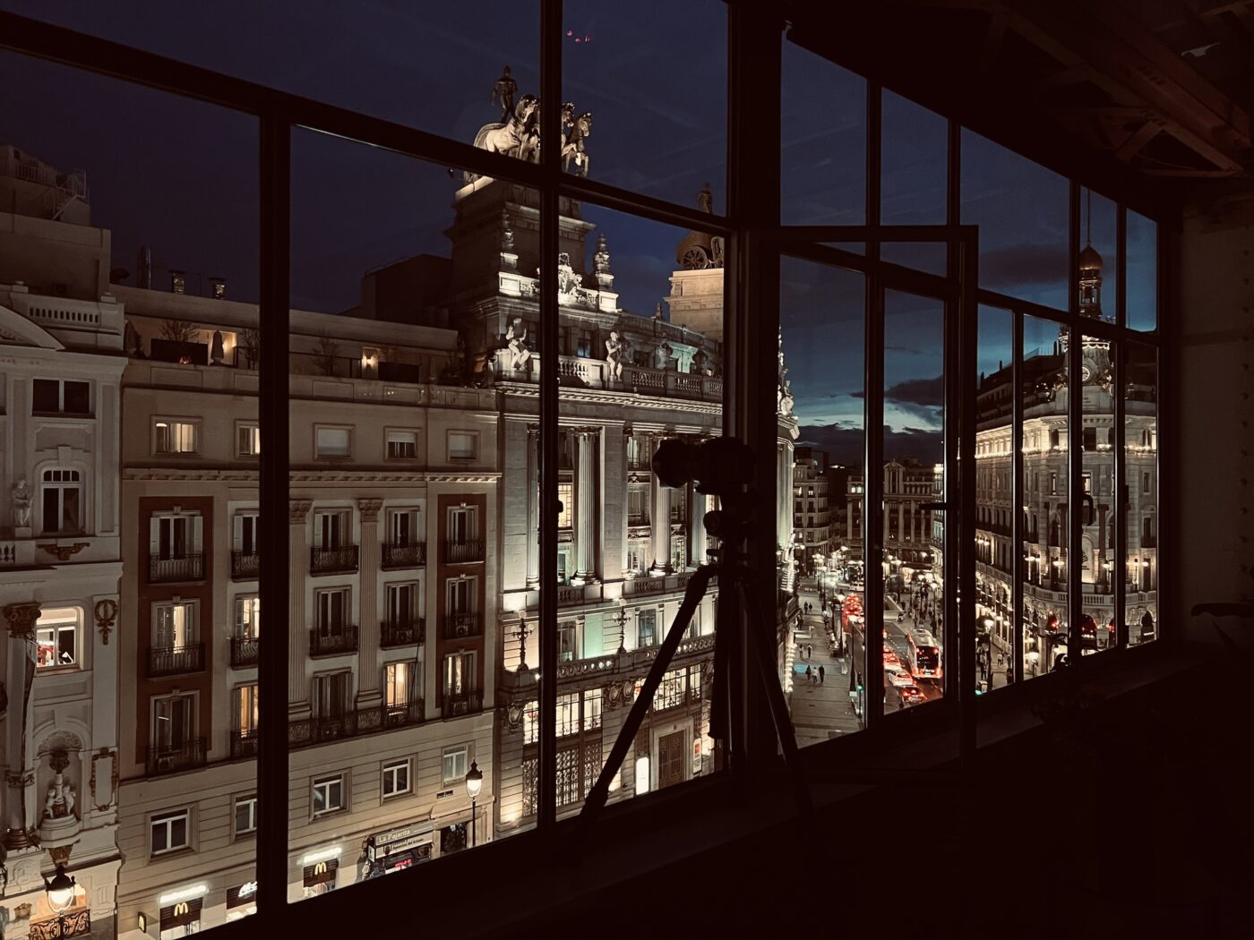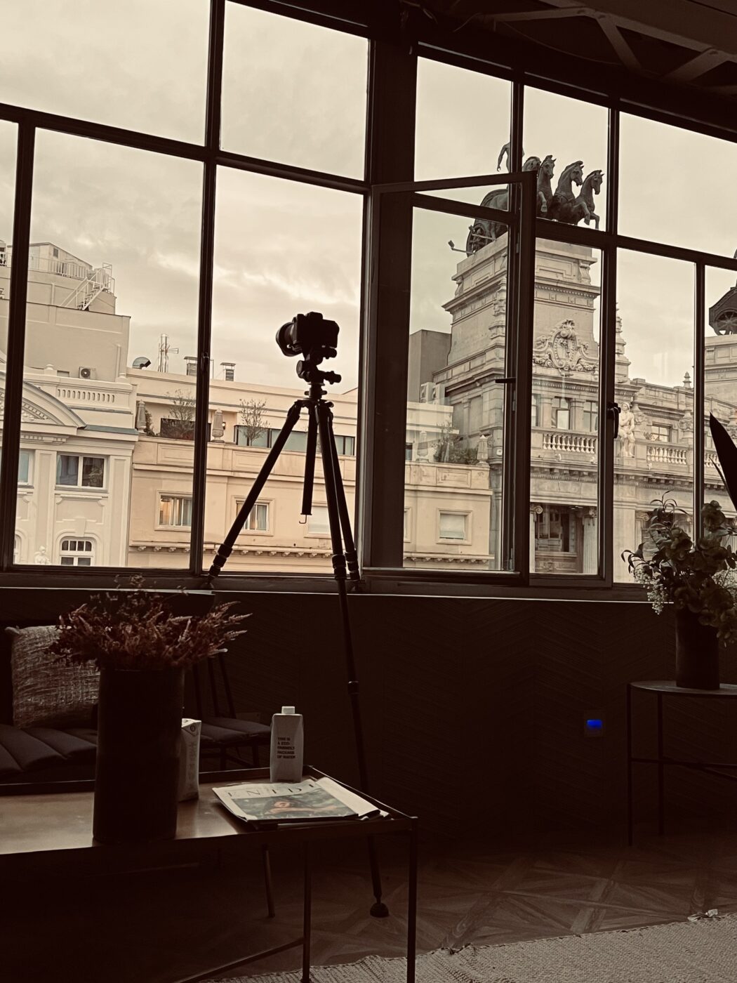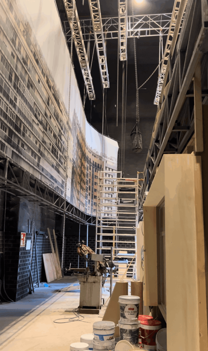Por su parte, para ‘La agencia‘ se hizo un forillo que rodeaba totalmente el decorado diseñado por Marcelo & Partners. “Hicimos fotos desde una localización de ensueño en la calle Alcalá, frente al edificio Recoletos, y con esas fotos y otras de nuestro archivo realizamos el forillo de casi 70 m de largo por 4 de alto ubicado en los platós de Ciudad de la Imagen. El mayor reto técnico fue en el montaje, ya que el forillo iba por partes, con dos curvas y mucho cajeado al tener que hacer puertas y partes móviles”, recuerda Javier.