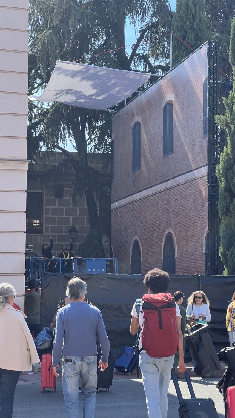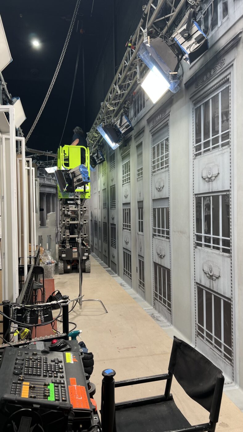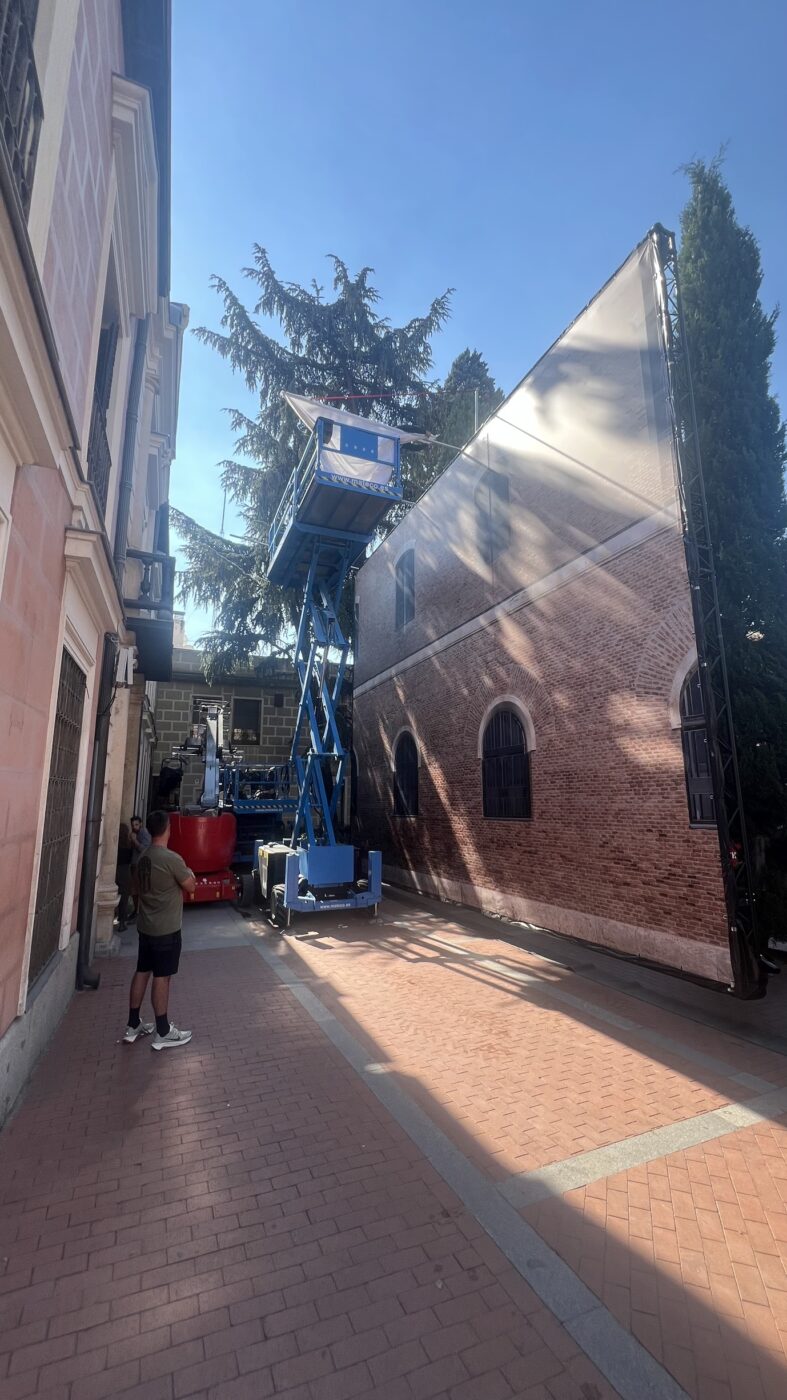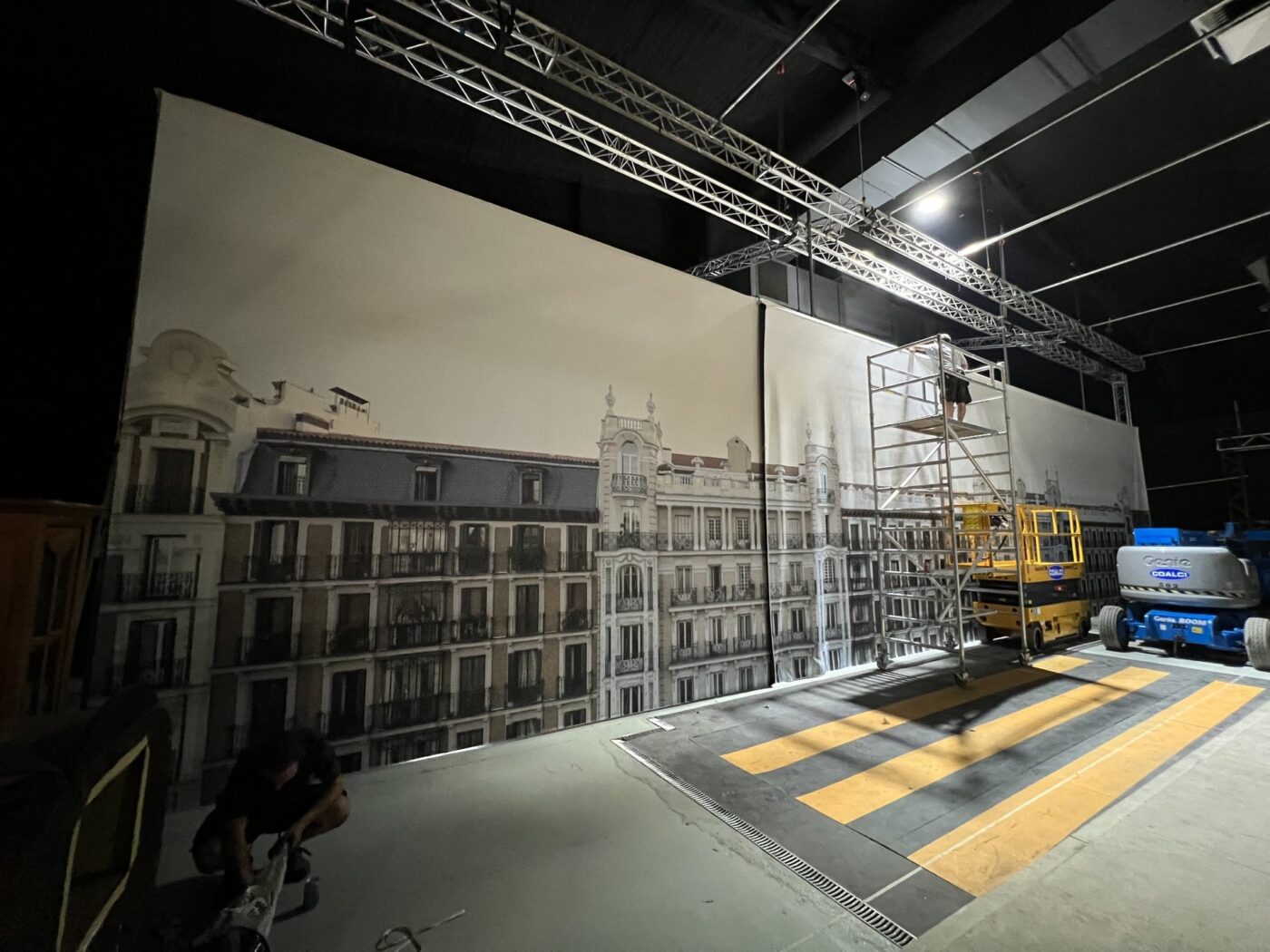 Junto a la diseñadora de producción Barbara Pérez Solero, se realizó un forillo para un decorado de la 4T de ‘Daryl Dixon‘, localizado en Alcalá de Henares. “Fotografiamos una fachada en Alcalá, y posteriormente adaptamos las fotos para una secuencia de acción increíble con una caída a través de la ventana con nuestro forillo de fondo”, dice Alvariño. Impreso en un material muy resistente para montar en exterior, con 9 m de altura y 12 de ancho, se hace el forillo con varias piezas de 4,5 m uniéndolas con un termosellado prácticamente invisible que permite, a una cara, hacer los forillos del tamaño que se necesite.