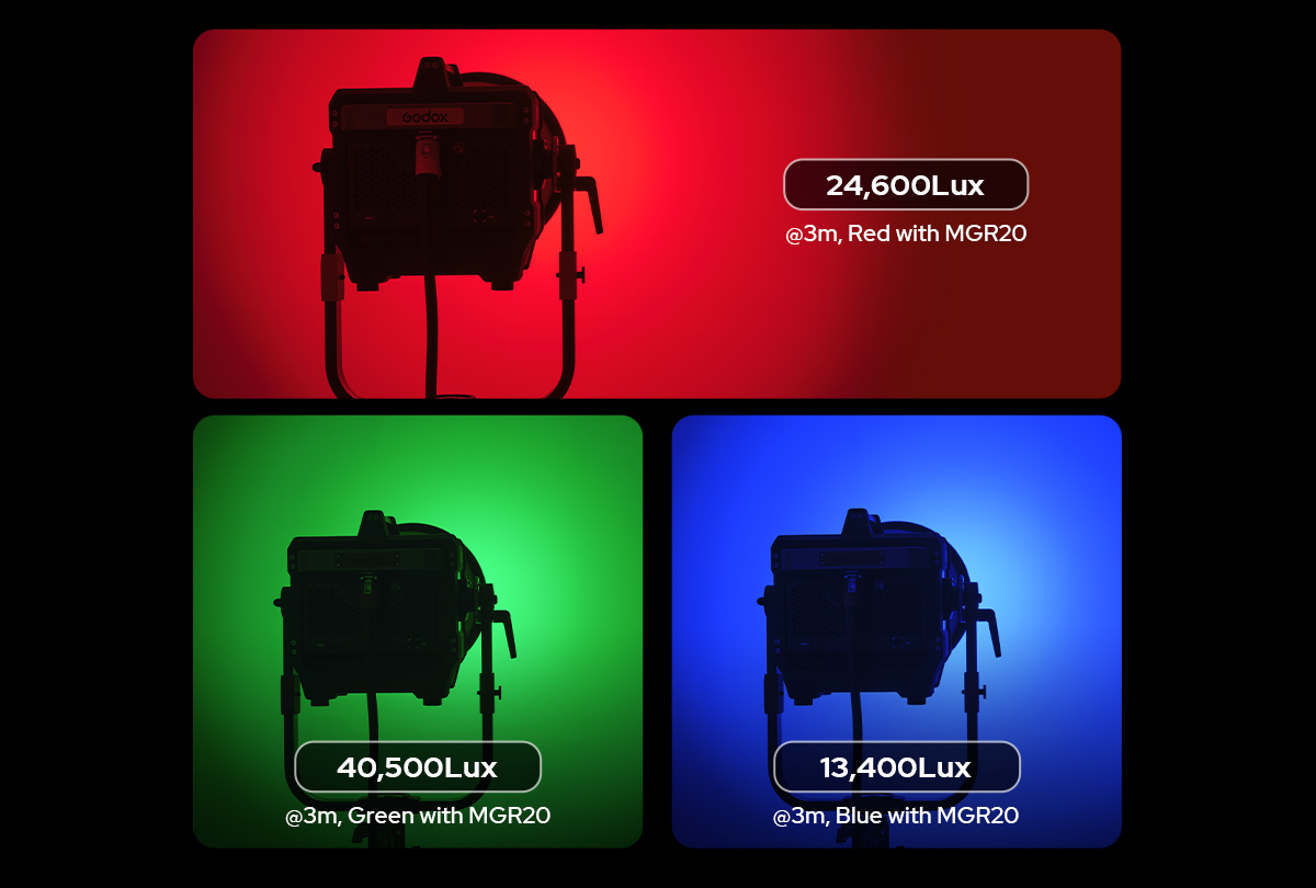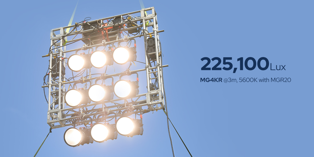 A 5600K y con el reflector MGR20, el MG4KR alcanza 225.100 lux a 3 metros y 24.600 lux en rojo, manteniendo una operación estable gracias a su sistema de refrigeración mejorado y a su compatibilidad con el ecosistema G-mount.