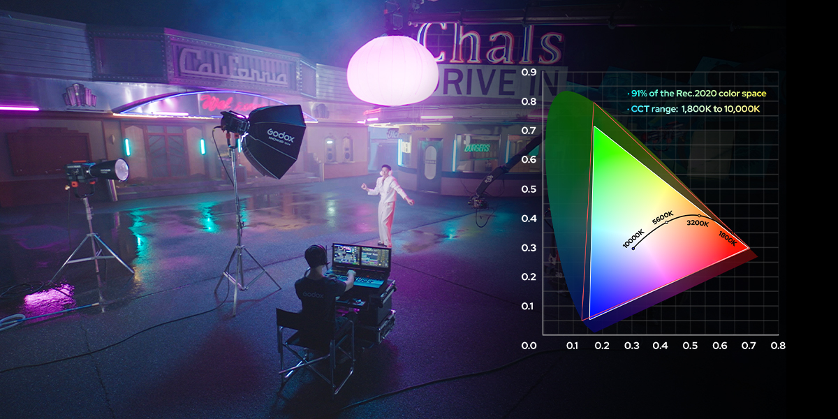 Con una cobertura del 91% del espacio de color Rec. 2020, el MG4KR proporciona una amplia paleta para la reproducción cinematográfica del color. Su rango CCT de 1.800K a 10.000K, combinado con un ajuste verde-magenta de ±100%, permite a los cineastas igualar la iluminación ambiental, refinar tonos de piel y crear atmósferas específicas con precisión.