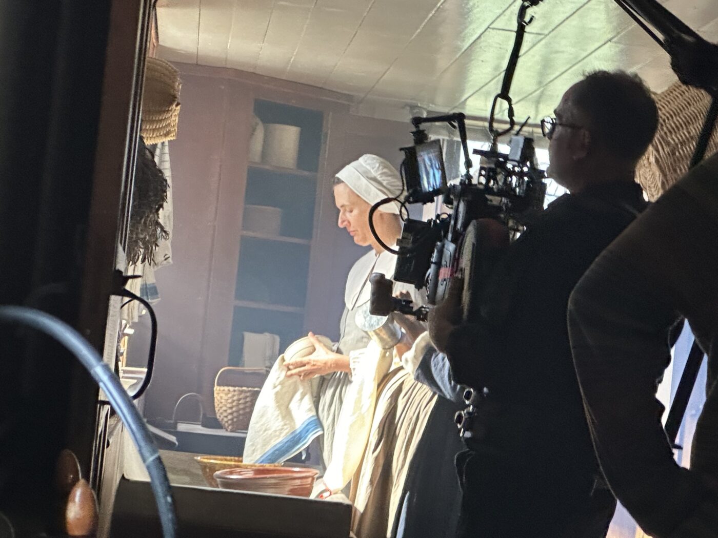 Sí, y ella sopla la vela. Eso fue en una aldea shaker real en el estado de Nueva York. Allí tenía un tubo Astera colgado justo encima de ella, metido dentro de una funda difusora, para darle ese pequeño toque azul, muy suave. La luz entra como a 4.800 K, dándole un poco de luz envolvente, además de la vela. Allí había otro Astera a 2.600 K, cálido. Cuando ella sopla la vela, apagamos ese y dejamos solo ese pequeño contraluz. En esa escena solo éramos dos personas, porque fue después de haber terminado prácticamente el rodaje, y subimos allí solo para conseguir algunos planos de transición. Fuimos solo Mike, un gaffer de Nueva York con el que llevo trabajando 30 años, y yo. Un equipo muy pequeño. Así es como respondo a tu pregunta de cómo se hace algo así por ese presupuesto.