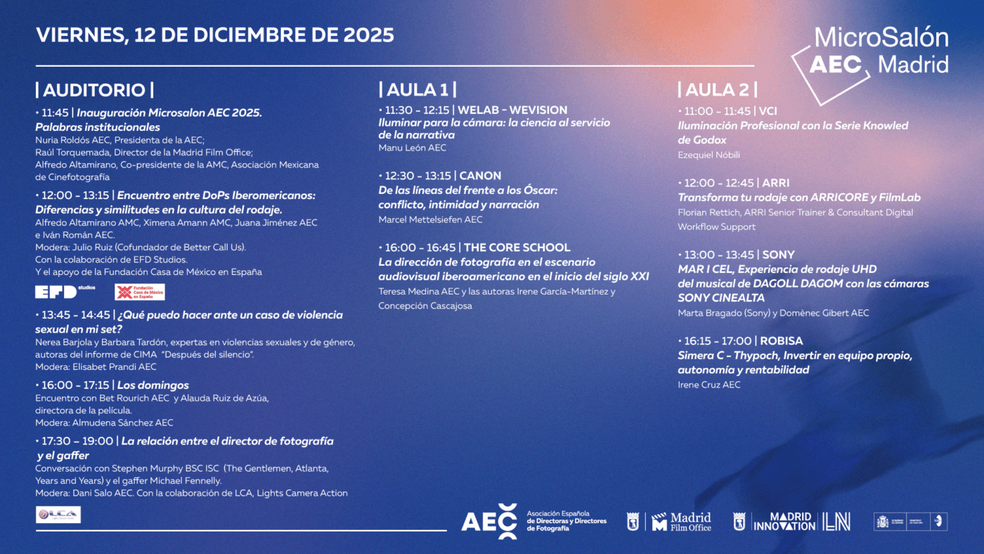 Como actividad complementaria al MicroSalón, EFD Studios, junto con la Fundación Casa de México en España, organiza la proyección de ‘En el camino’ (David Pablos) el 11 de diciembre a las 18:30 h en la sede de la Fundación (C/ Alberto Aguilera, 20, Madrid). Tras la proyección, tendrá lugar una conversación con su DoP, Ximena Amann (AMC), un espacio pensado para profundizar en el proceso creativo y técnico del proyecto y favorecer el diálogo entre profesionales.