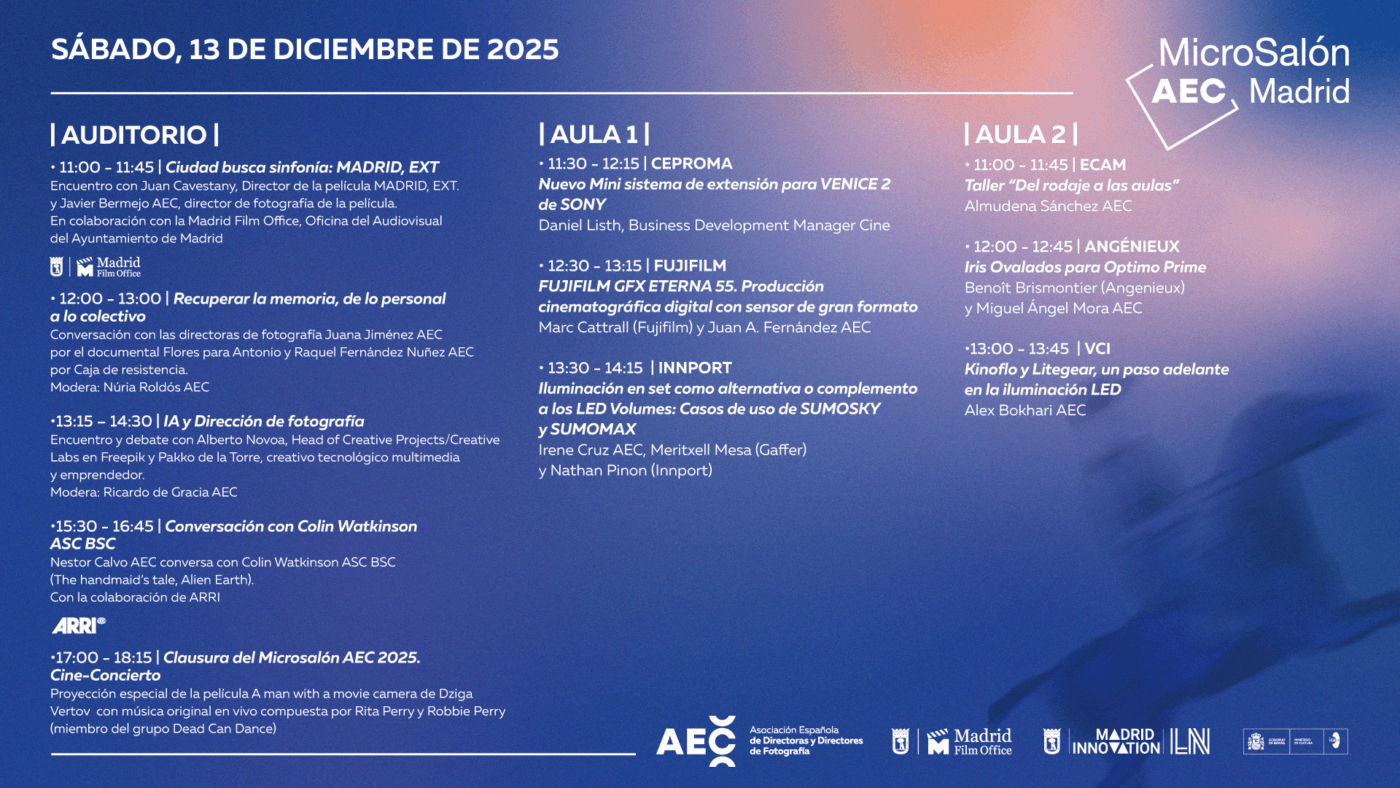 La ECAM presenta en el Microsalón con un taller y dos stands informativos sobre sus distintas formaciones. El sábado 13 a las 11:00h, Almudena Sánchez, profesora y directora de fotografía, impartirá el taller Del rodaje a las aulas, mostrando cómo la experiencia en set puede convertirse en herramientas pedagógicas para la formación cinematográfica de los futuros cineastas. Además, los asistentes podrán informarse en el stand de la ECAM sobre másteres como Restauración y Preservación Fílmica, Color y Etalonaje Digital, y Dirección de Fotografía, y en el stand de Escuela de Oficios sobre cursos intensivos en dirección de fotografía, movimiento y estabilización, grip, revelado en Super 8 y maquinismo.